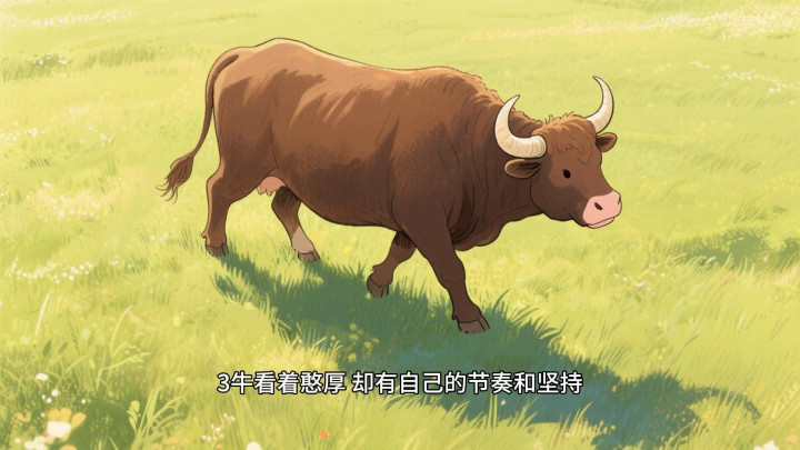 ·3、牛看着憨厚却有自己的节奏和坚持,大家都在跟风起哄的时候,它可能还是踏踏实实走自己的路,不被外界的混乱带偏。这种不为所动的踏实劲儿,就像在喧嚣中保持清醒的状态。