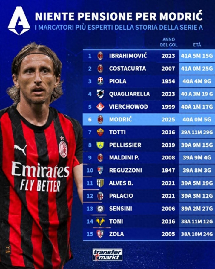 直播吧9月15日讯 意甲第3轮比赛,莫德里奇破门,帮助米兰主场1-0击败博洛尼亚。德国转会市场列出了意甲年龄最大进球者排名,伊布居首,莫德里奇排名第6位。