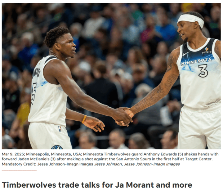 据HoopsHype名记Michael Scotto报道,森林狼队已向灰熊询价了莫兰特。双方就莫兰特交易进行了严肃认真的正式谈判。但是据报道,灰熊队暂时不愿意交易莫兰特,希望保持现有阵容不变。