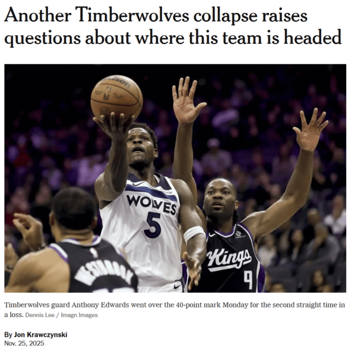 森林狼队记Jon Krawczynski写道:“森林狼队的球迷群体如今满心焦虑,这也情有可原。球队近两场比赛的收官阶段打得极为难看。值得一提的是,这支队伍向来有赛季中途逐步调整好状态、在赛季后期强势发力的传统,接下来就看这群球员能否延续这一惯例了。”