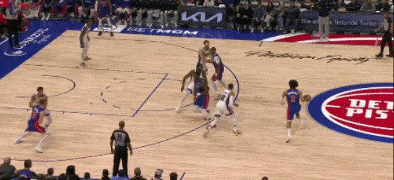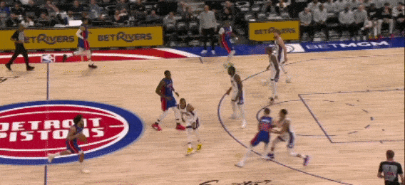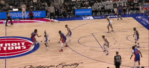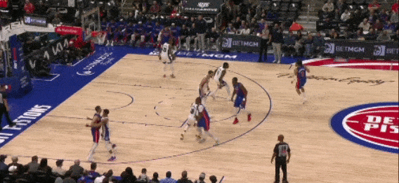 坎宁安刚刚运球过半场,邓罗从一侧绕切到另一侧,带走防守,清空了哈里斯前进路线,当坎宁安吸引了阿丘瓦补防时,立刻分给哈里斯,顺下畅通无阻,
