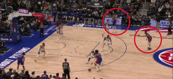 再比如坎宁安在强侧高位单打阿丘瓦,邓罗就在弱侧底角拉空间,确保坎宁安往篮下突破时,防守人不会收缩包夹